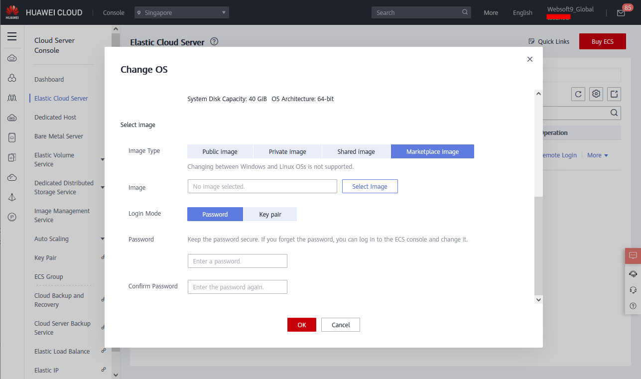 • Manage Image/Disk >Change OS for already existing ECS